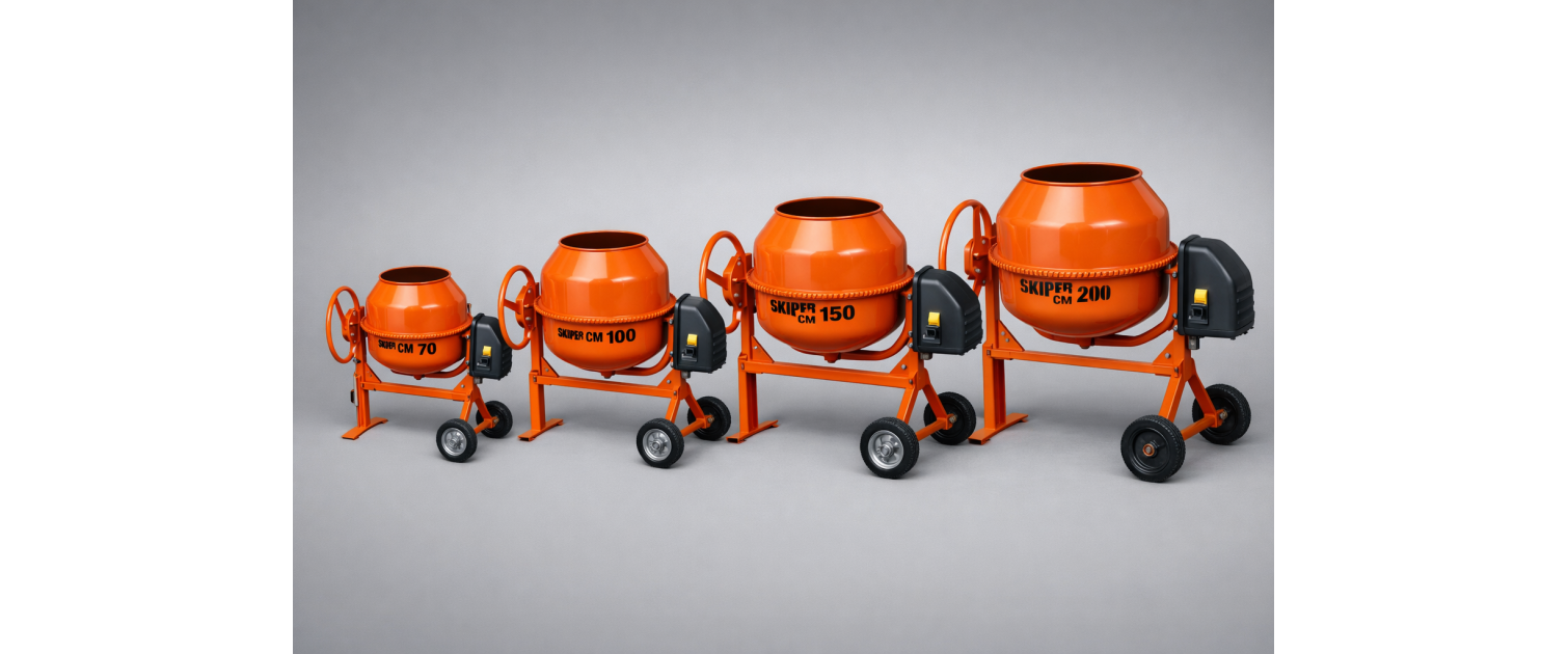 Линейка CM у SKIPER — это мобильные гравитационные бетоносмесители, рассчитанные на питание от обычной сети 220 В. Для частного дома, дачи, гаража и небольшого строительного объекта это важный плюс: не нужен особый формат подключения, технику можно использовать в привычных бытовых условиях. Во всей линейке прослеживается понятная логика: по мере роста объема растут возможности по готовой смеси за цикл, а вместе с ними меняется характер работ, для которых модель становится действительно удобной. При этом сами машины остаются в понятном бытовому пользователю формате, без перехода в тяжелый промышленный сегмент.