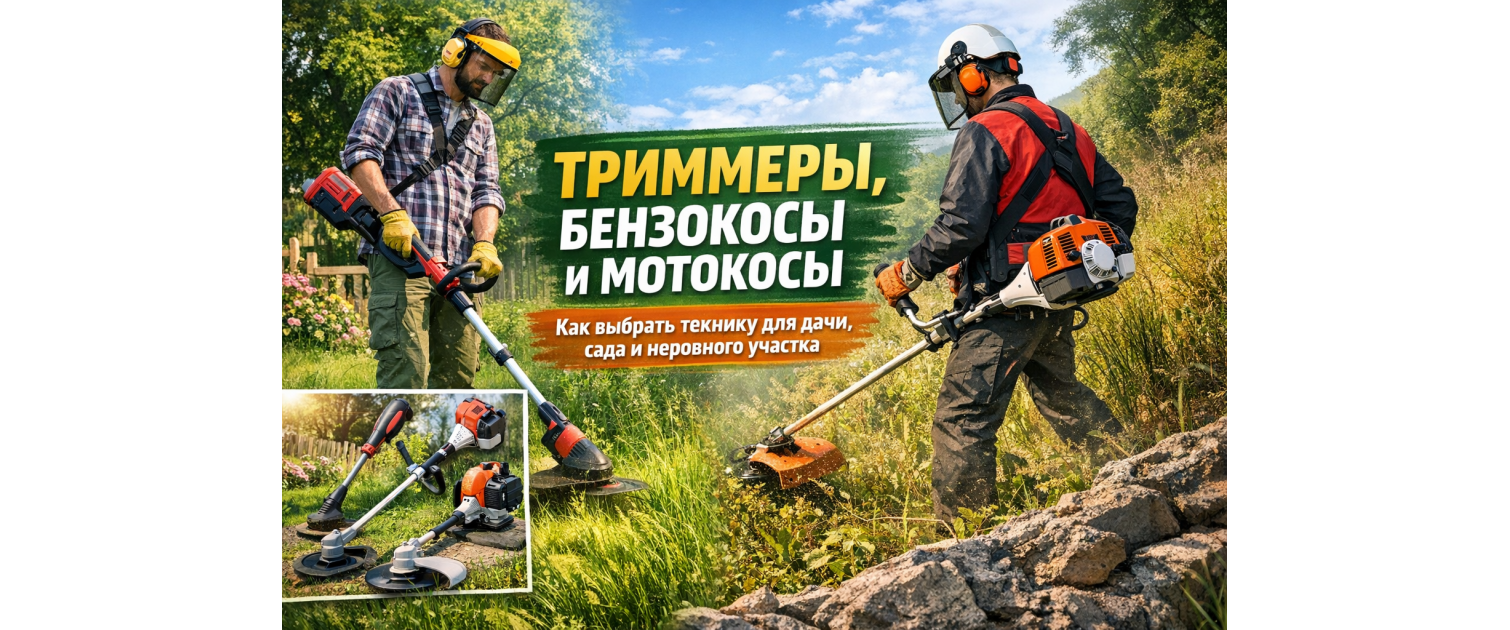 На белорусской даче редко бывает идеально ровный английский газон. Чаще всего на участке вместе живут кромки вдоль дорожек, трава у забора, молодая поросль возле сада, неровные откосы, пространство вокруг теплицы и места, куда обычной газонокосилкой не подлезть. Именно здесь триммер становится не «дополнением к газонокосилке», а главным рабочим инструментом. В каталоге Agrox.by раздел триммеров, бензокос и мотокос выделен как отдельная большая категория, а внутри него есть подкатегории бензиновых, электрических, аккумуляторных, 4-тактных, разборных, мощных и облегчённых моделей. Это сразу подсказывает правильную логику выбора: искать не “что-нибудь для травы”, а инструмент под конкретный сценарий работы.
