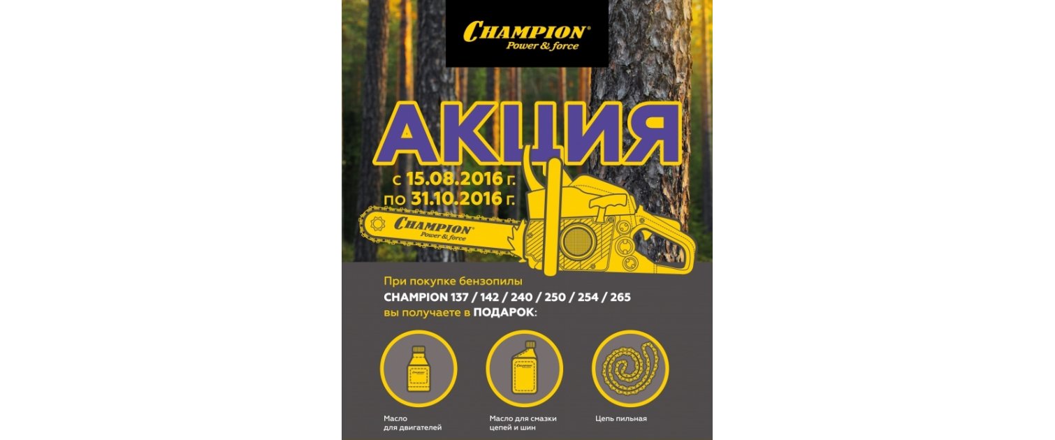 Мы рады сообщить вам, что с 15 августа по 31 октября 2016 г. при покупке бензопилы CHAMPION вы получаете подарочный набор!