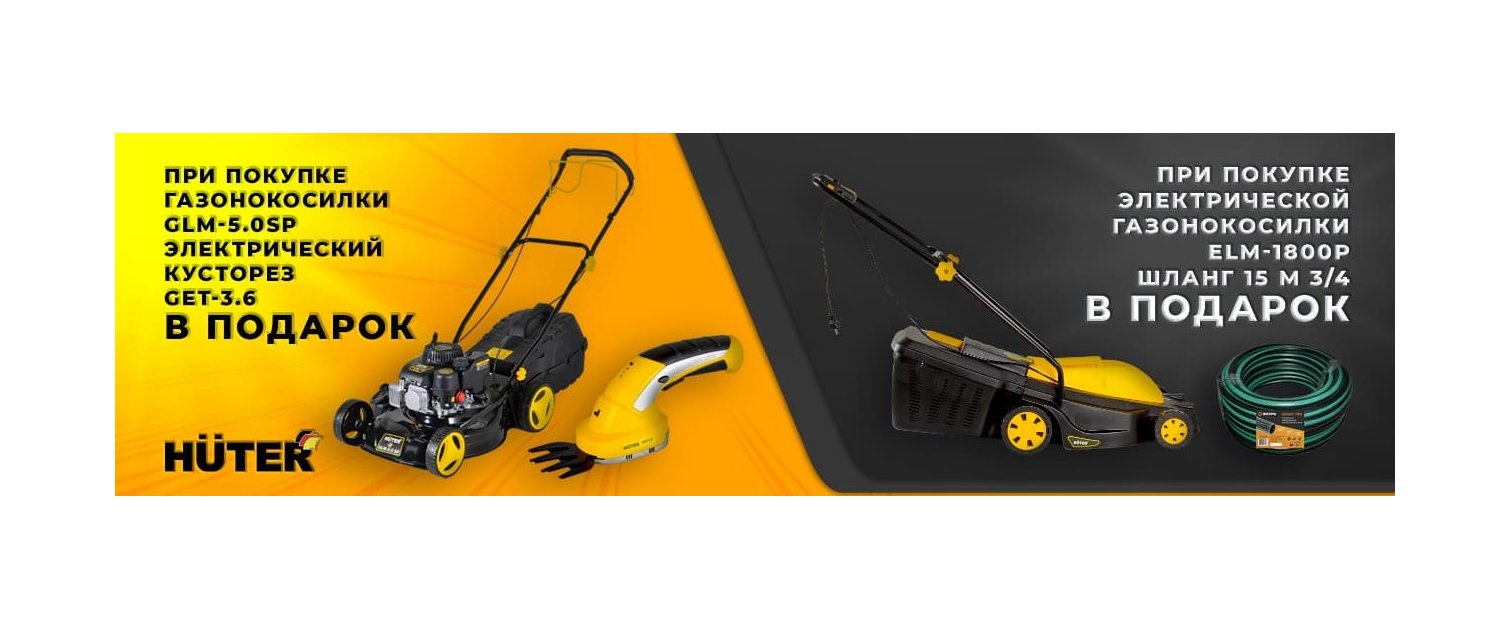 При покупке газонокосилки Huter GLM-5.0SP - электрический кусторез Huter GET-3.6 в подарок.
