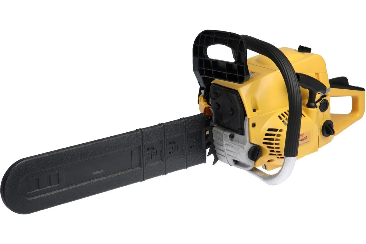 Сердце бензопилы — двухтактный двигатель мощностью 3.3 л.с., который легко справляется даже с твердыми породами дерева. Большой топливный бак (0.55 л) позволяет работать до 2 часов без остановки, а зубчатый упор обеспечивает точность реза, предотвращая соскальзывание инструмента. Регулировка натяжения цепи выполняется сбоку — вам не придется контактировать с острыми звеньями. Эргономичные прорезиненные рукоятки снижают вибрацию, делая работу комфортной даже при длительной эксплуатации.
