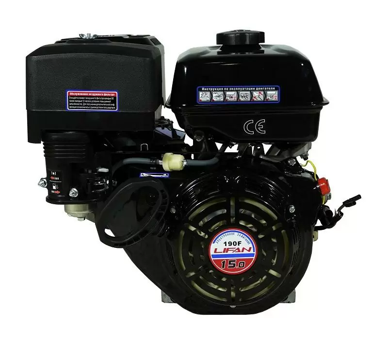 Бензиновый двигатель Lifan 190 F/ДБГ - 15.0 применяют для машин и агрегатов среднего мощностного диапазона. Развивает мощность 15 л.с., обладает топливным баком объемом 6,5 л, имеет вес 34 кг. В действие приводится удобной ручкой ручного стартера. Доброкачественное изготовление из высокопрочных материалов позволяет повысить срок службы двигателя. Воздушная система охлаждения с принудительной циркуляцией имеет высокую степень эффективности и поддерживает температуру двигателя в заданном диапазоне.