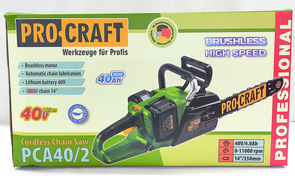 Procraft PCA40/2 - беспроводной инструмент, применимый для подрезки веток и распиливания деревьев диаметром до 35 см. Его цепь заточена под углом 30о, что способствует чистому срезу и кустарников, и сучьев, и разнообразных строительных материалов.
