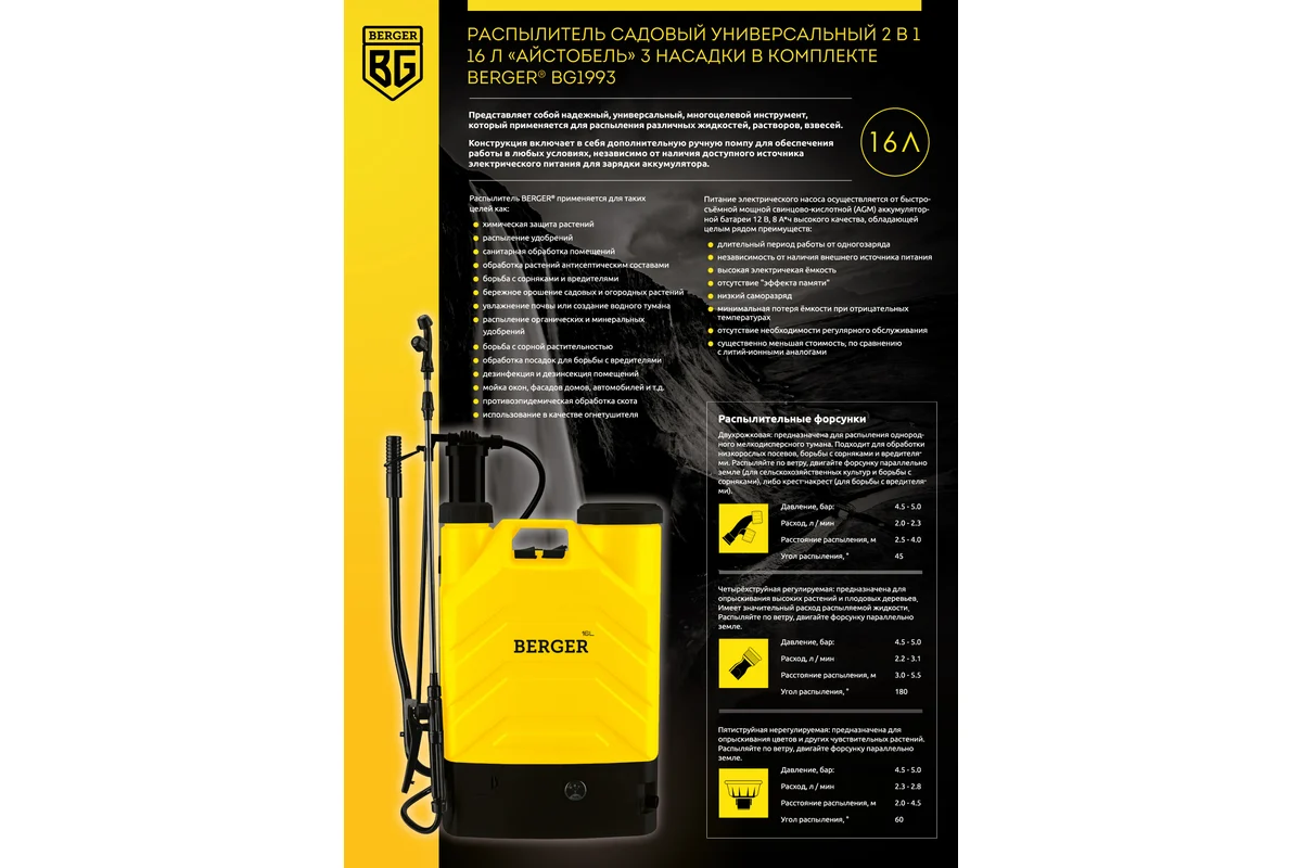 Этот опрыскиватель оценят садоводы, фермеры и владельцы загородных домов. Регулируемый расход жидкости (до 3,1 л/мин) и химически стойкие материалы обеспечат бережную обработку растений или эффективное нанесение моющих средств. Хотите сэкономить время и силы? Закажите Berger BG1993 прямо сейчас с гарантией быстрой доставки — и забудьте о рутине!