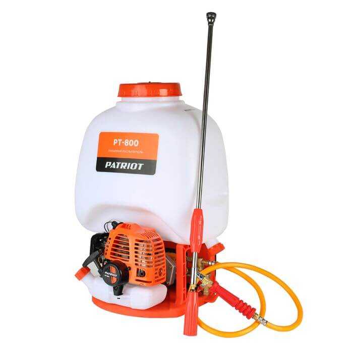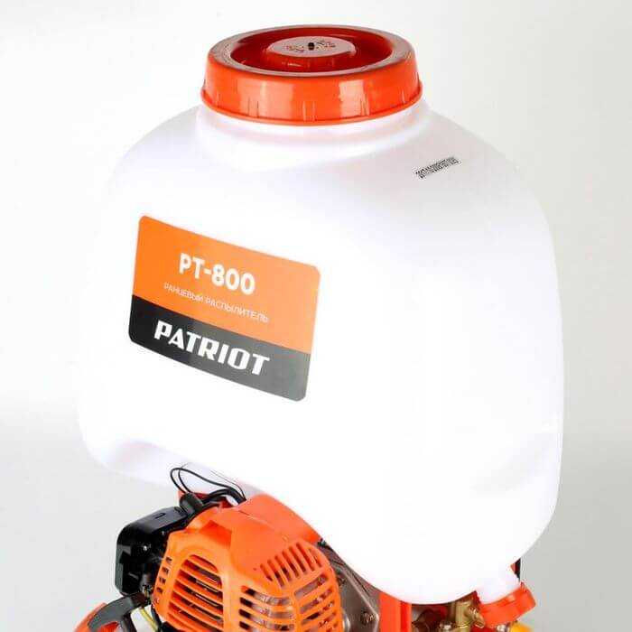Patriot PT-800 - аппарат, комплектуемый тремя удлинительными трубками. При его помощи можно осуществлять направленную и селективную обработку растений. Для удобной переноски инструмента он снабжен двумя широкими ремнями. Конструкция абсолютная герметичная и не представляет угрозы для пользователя.