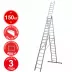 Три секции соединяются надёжным образом, исключая люфт и обеспечивая жёсткость даже при значительных нагрузках. Рифлёные алюминиевые ступени обеспечивают отличное сцепление и снижают риск скольжения, что особенно важно при работе на больших высотах. Усиленные профили делают лестницу максимально прочной и устойчивой, сохраняя при этом достаточную лёгкость для удобной эксплуатации. Двустороннее восхождение расширяет функционал, позволяя безопасно работать сразу нескольким специалистам.