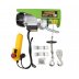 Устройство состоит из следующих частей: электродвигатель, редуктор, тормоз канатного барабана, стальной трос, крюковая подвеска и пусковая аппаратура. Двигатель 540 Вт мощности, способен поднять груз на высоту до 6 метров, несмотря на такие показатели, подъемник компактный, небольшой по габаритам и весит всего 12 кг. Контроль работы осуществляется посредством дистанционного пульта управления, на котором расположена красная клавиша для блокировки от случайного включения и черная - для запуска и выбора направления подьема. Стоит отметить, что в комплекте предоставлены стальные скобки с винтами и гайками, что позволяет крепить устройство за трубы, металлические опоры и т.п.